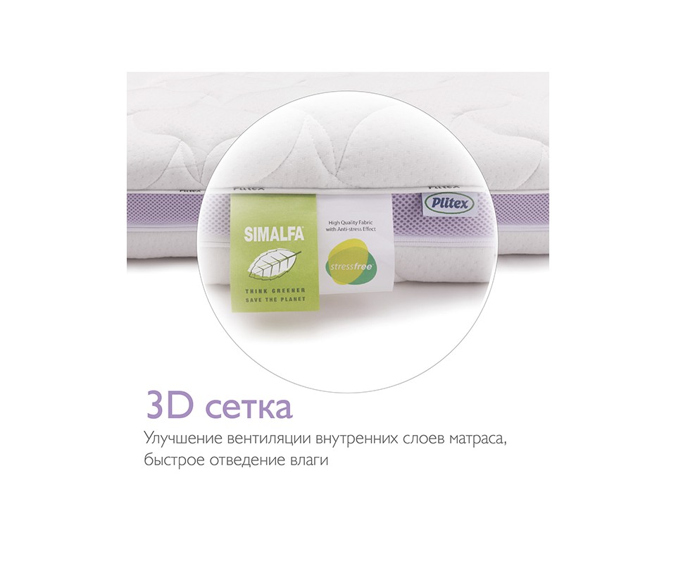 Материал внешнего чехла быстро впитывает влагу и высыхает за считанные минуты, а 3D сетка по периметру улучшает вентиляцию наполнителей. Кроме того, чехол отлично подходит для деликатной стирки. Молния с трех сторон позволяет быстро снимать и надевать его после чистки. Все слои матраса закреплены специальным экологичным составом Simalfa