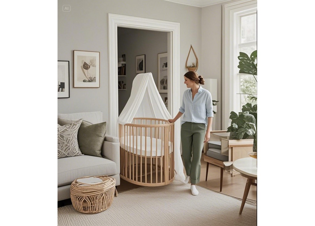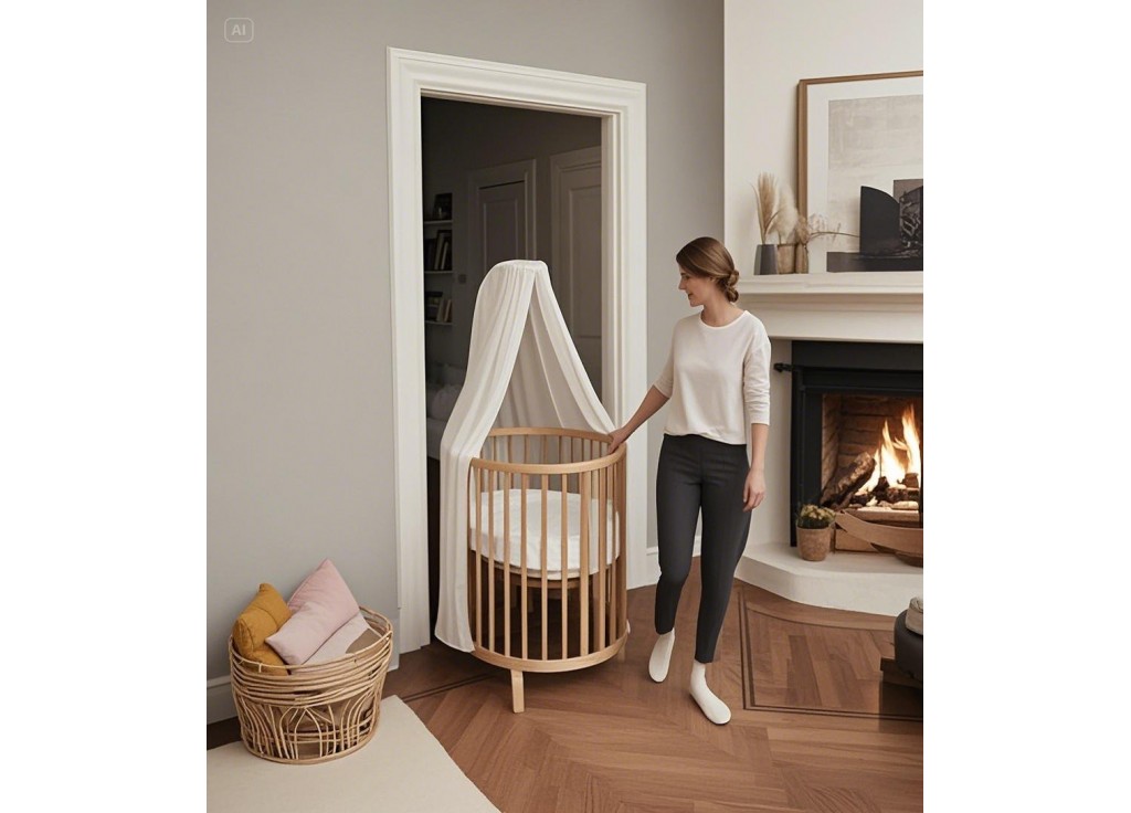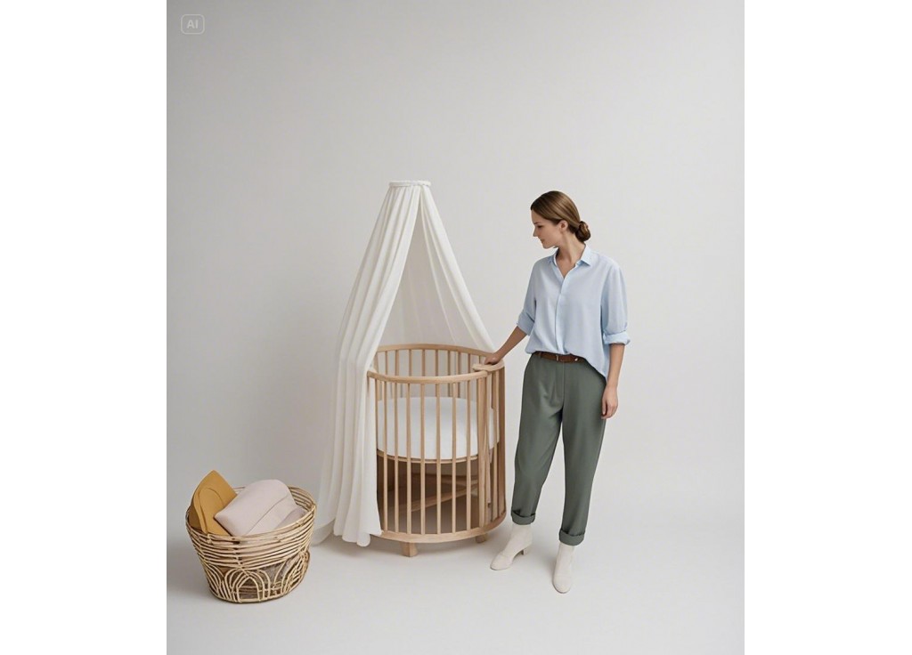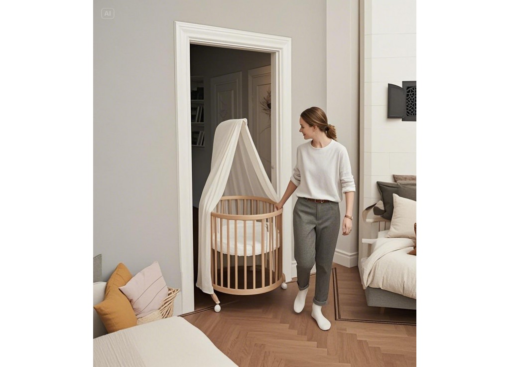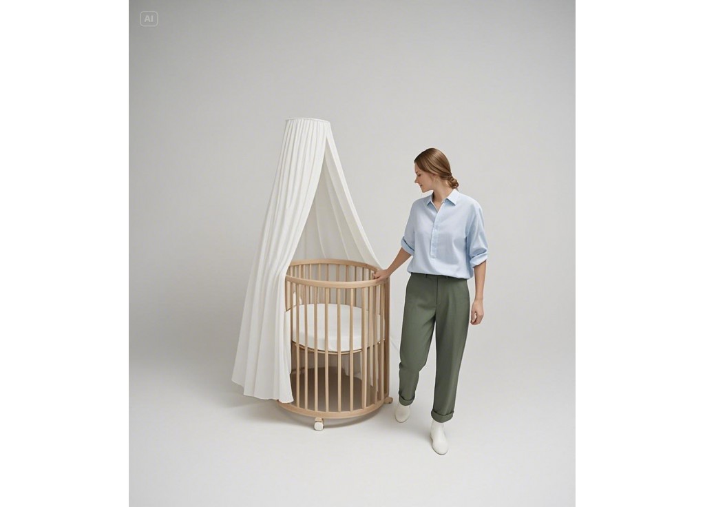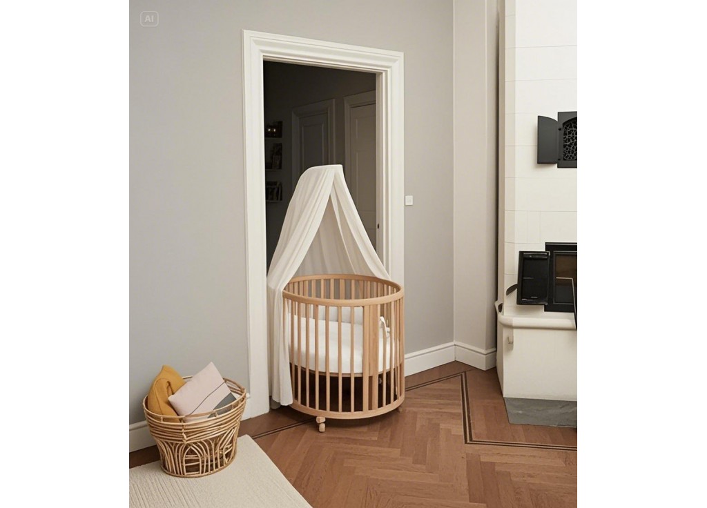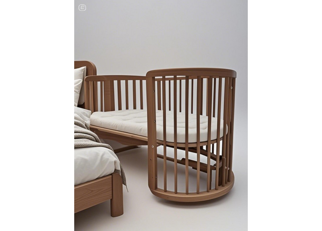 Круглая/овальная или прямоугольная кроватки на колесиках очень Лёгкие в управлении. Проходят в стандартные дверные проёмы спальных и ванных комнат…